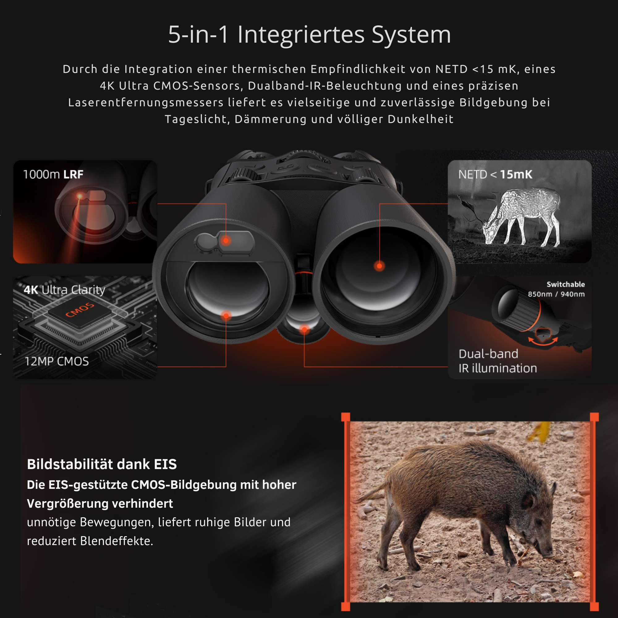 ➤ Multispektrales 5-in-1 System: Nahtlose Fusion von 640er Wärmebild, 4K-Nachtsicht & LRF.